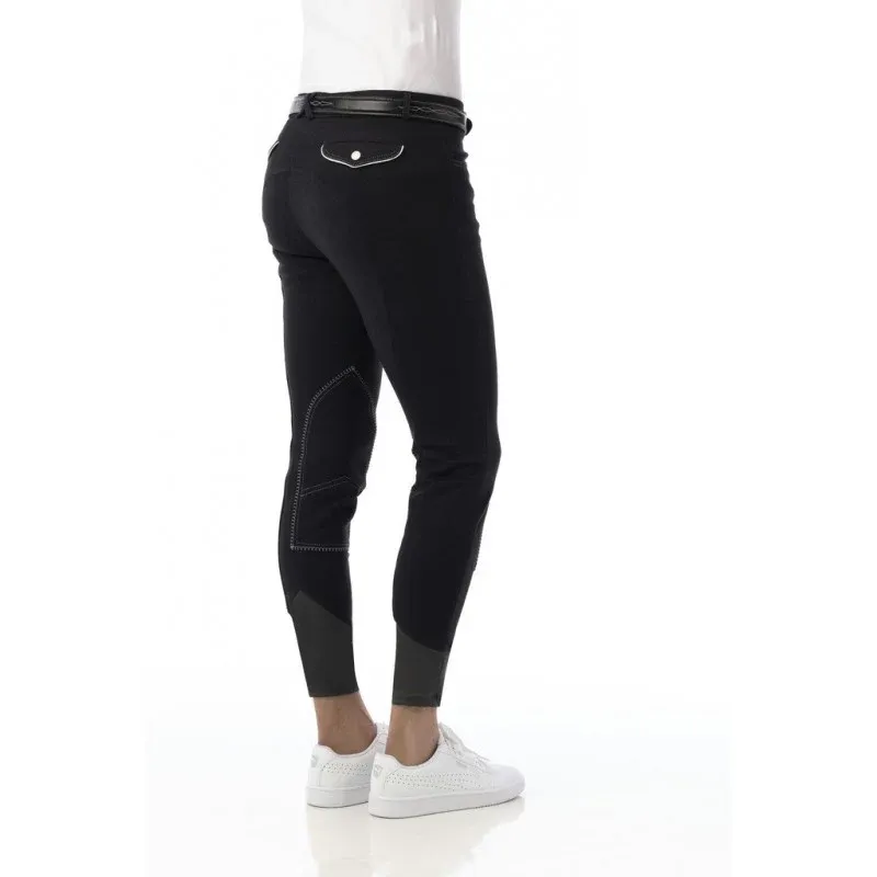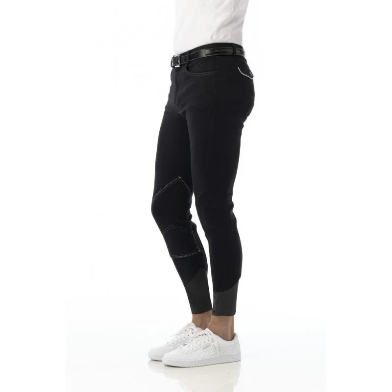 Pantalon style maille avec bas de jambe extensible en élasthanne double épaisseur qui facilite l’enfilage et garantit un positionnement fixe sans aucune gêne. Coupe droite près du corps avec fond découpé et basanes tissu. Poches cavalières à l’avant et poches à rabat pressionné à l’arrière. Ceinture antidérapante à passants, fermeture à crochet. Surpiqûres et passepoils de poches arrière en couleur contrastée. Composition : 95 % coton, 5 % élasthanne. Lavable en machine à 40°C.
