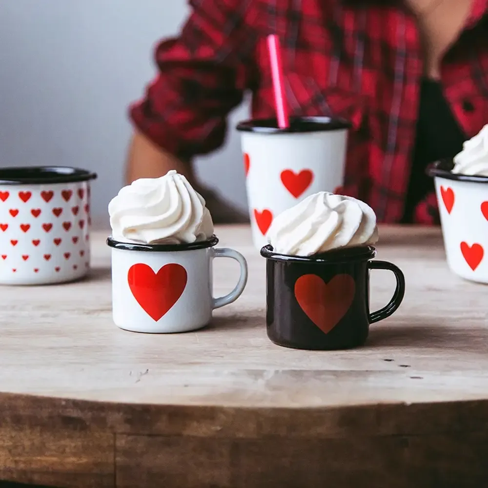 On craque pour cette ravissante tasse à expresso en émail au design cœurs rouges sur un fond blanc.