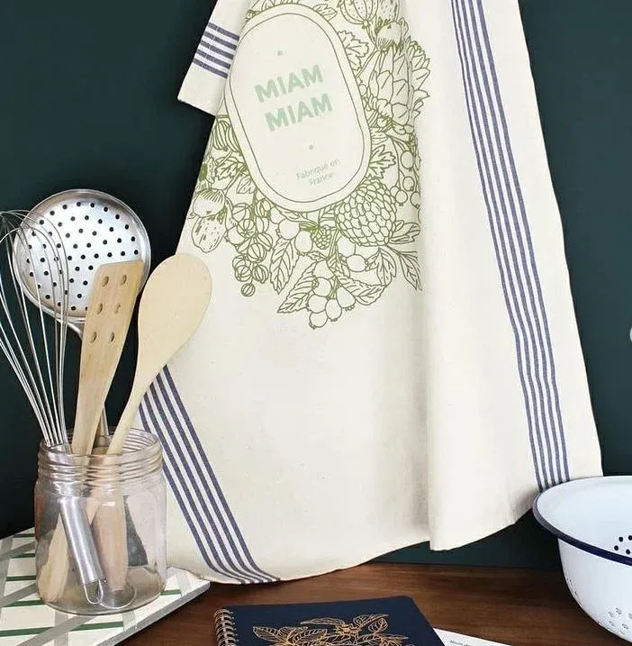 Voici le ravissant torchon de cuisine Abondance à l’inscription parfaite” Miam Miam” imaginé par la marque française Les Editions du Paon, dans une démarche de qualité.